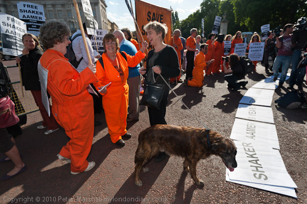 A very familiar dog at protests - its lead held by Kate Hudson of CND