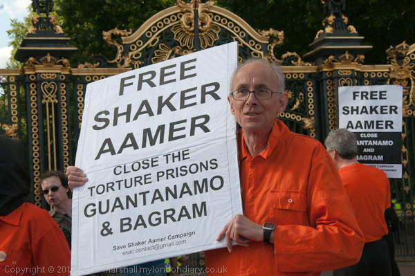 Save Shaker Aamer Campaign with orang Guantanamo jumpsuits and a man in chains with an Obama mask