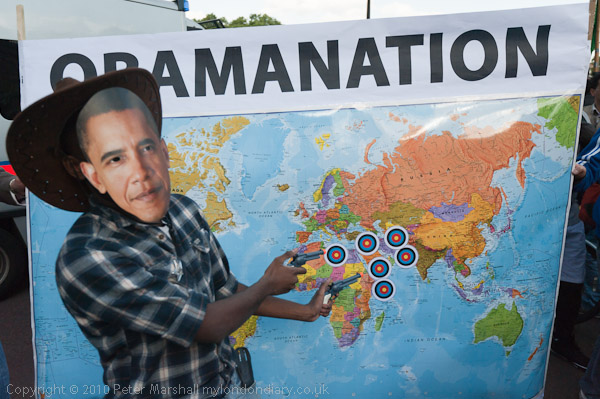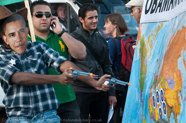 ![]() Stop the War came with a cowboy wearing an Obama mask and firing his six-shooters at targets around the Middle East ![]() and the terrible pun 'Obamanation' as well as placards calling for troops out of Afghanistan ![]() as well as others (see below) calling for 'Hands Off Libya' ![]() |
