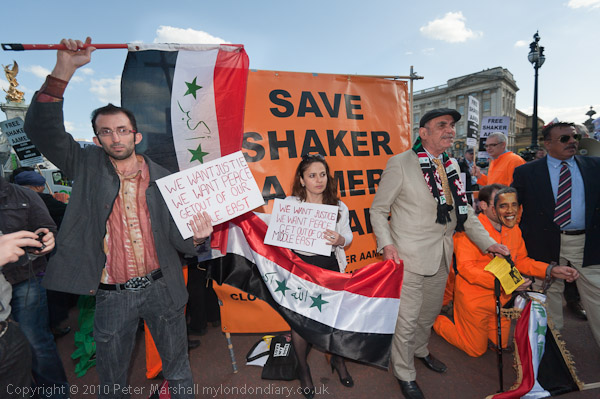 ![]() A small group were calling for the US to get out of Iraq, and posed with 'Obama' in chains for the Shaker Aamer campaign ![]() ![]() ![]() ![]() A demonstrator with the message 'House of Saud is Abode of Terrorism' |