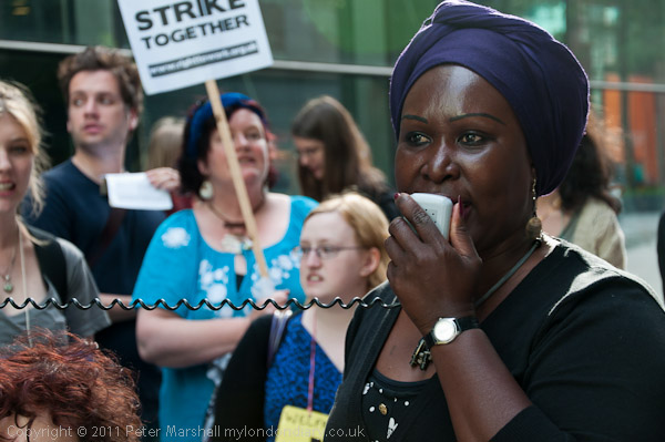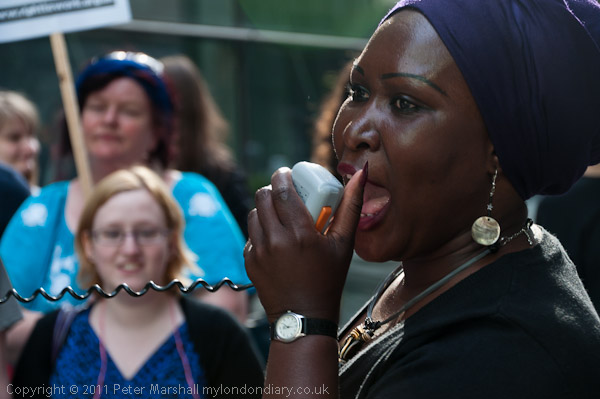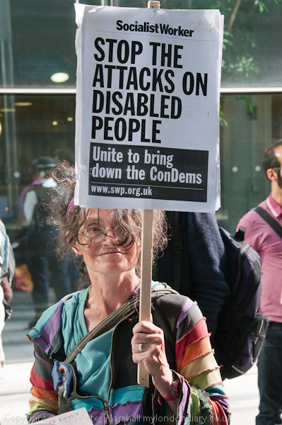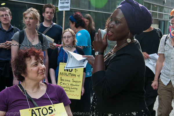 Clare from WinVisible speaking, with placards about June Mitchell, dying from lung cancer but entirely fit for work according to Atos testers