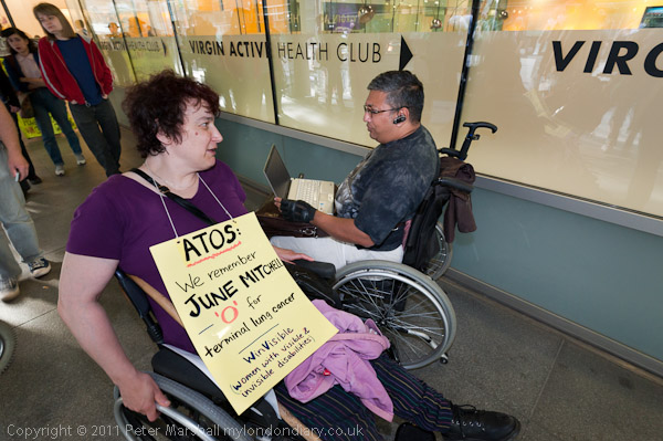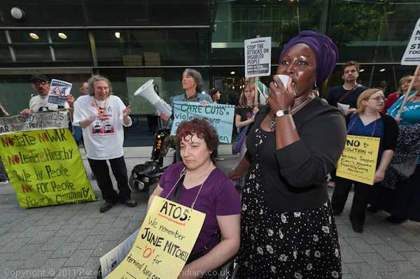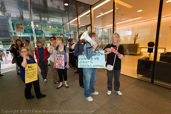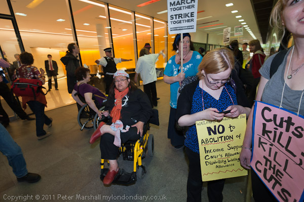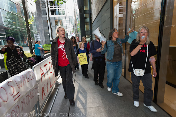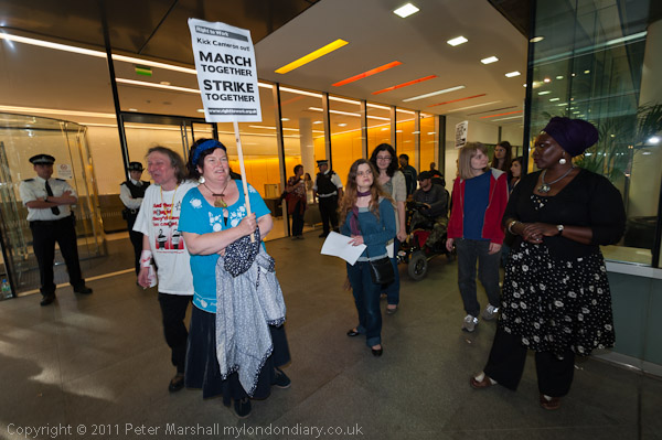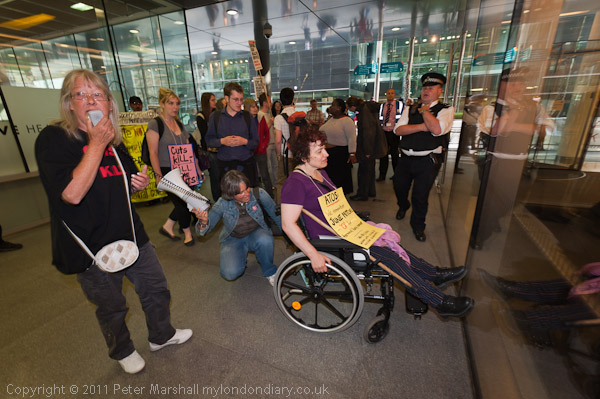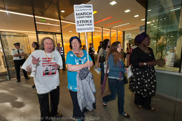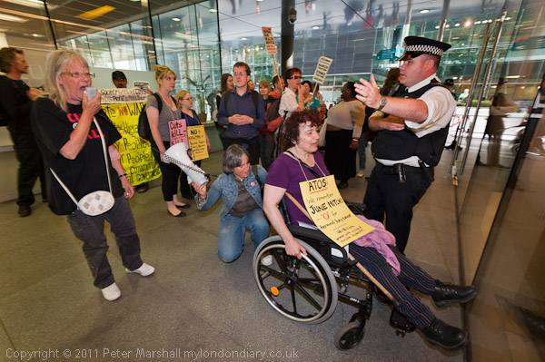 Protesters decide to walk around the barriers and carry on outside the shared reception for the Atos offices