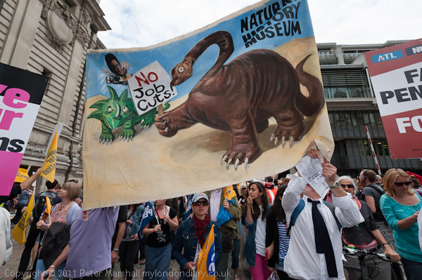 Dinosaurs from the Natural History Museum say 'No JOb Cuts'