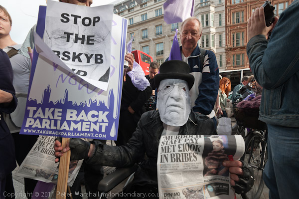 Around 50 people turned up for on time for a demonstration called at short notice by Take Back Parilament who want the undue influence exerted by Murdoch on our parliamentary system to be halted and reversed. They had not reckoned on the whole of central London being taking over by Pottermania, halting traffic and causing long queues at some underground stations. Many of the protesters arrived late, and they were still arriving as I left a little over half an hour after the demonstration had been due to start. Probably some gave up because of the congestion, which made even walking close to Trafalgar Square difficult.