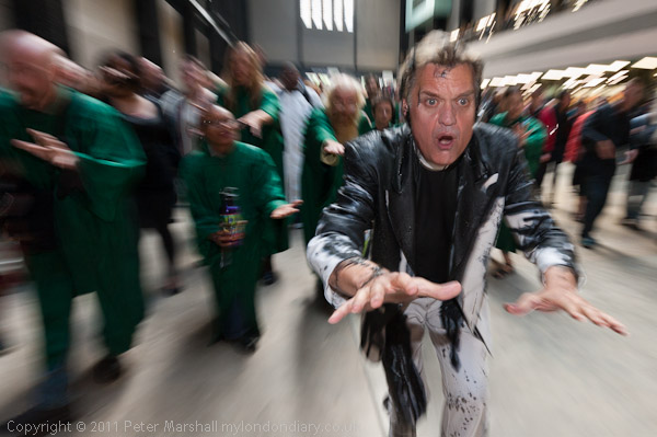 On the dot of 5.30pm, the Rev Billy and his congregation donned their robes in the middle of the Turbine Hall and the service began. After an introduction by the Reverend, the congregation began to dance around him and anointed him with 'oil', a dirty black mixture which made quite a mess of his trademark white suit.