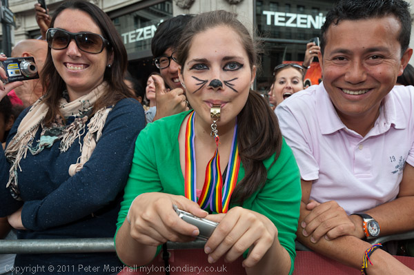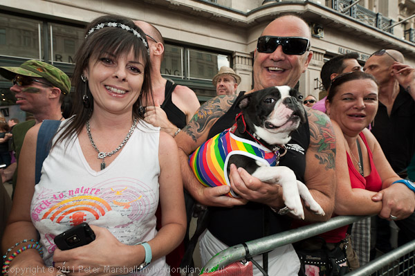 Crowds lined the streets, and I particularly liked this cat and (below) gay dog