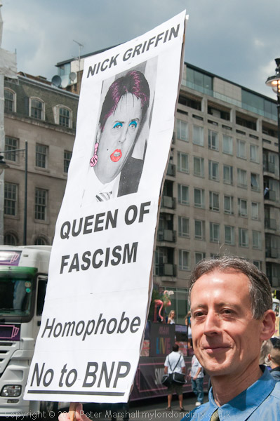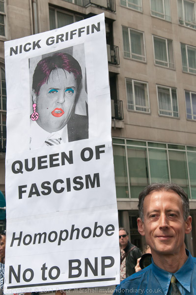 Peter Tatchell with his Nick Griffin 'Queen of Fascism' poster, calling him a homophobe and saying 'No to BNP' at the head of the march