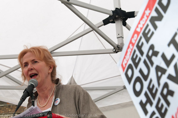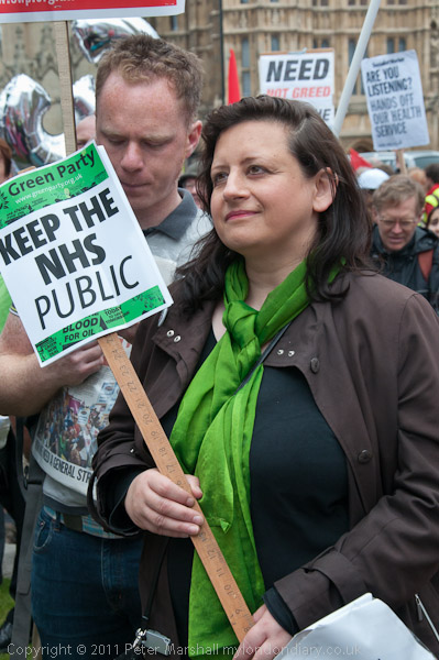 A carefully measured placard on a metre rule from the Green Party says 'Keep the NHS Public'