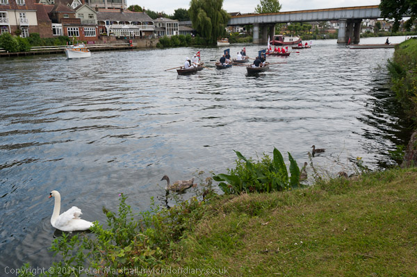 The swan and cygnets move out into the river, but two skiffs go past to turn them back