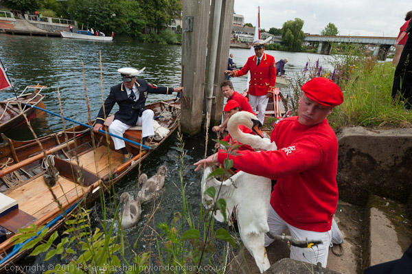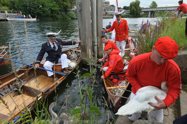 One of the Royal uppers has come on land and down the steps and grabs the female swan around its neck