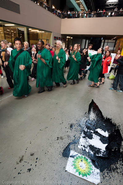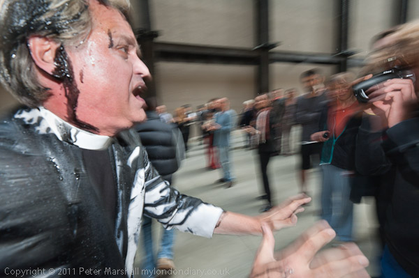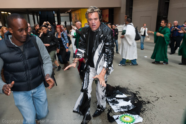 And Rev Billy starts a slow and staggering journey towards the BP logo on the sponshorship board