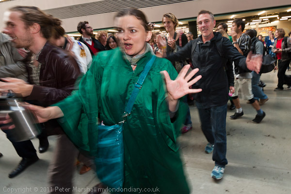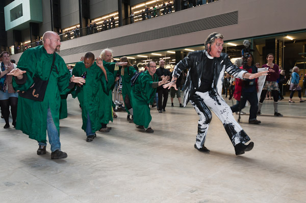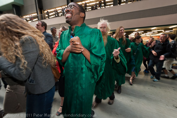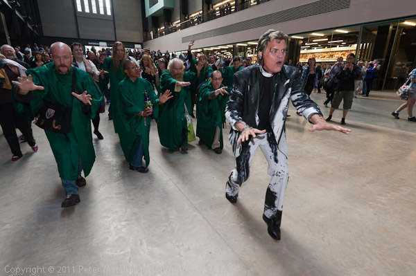 Rev Billy rises to join the congregation as they parade in a circle in the Turbine Hall