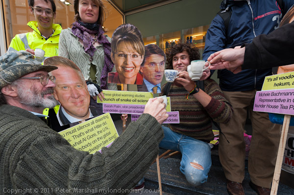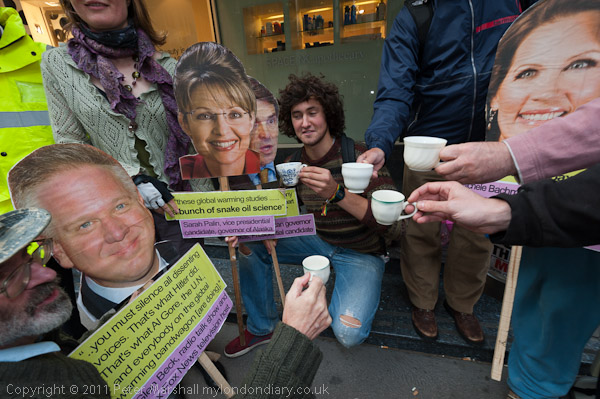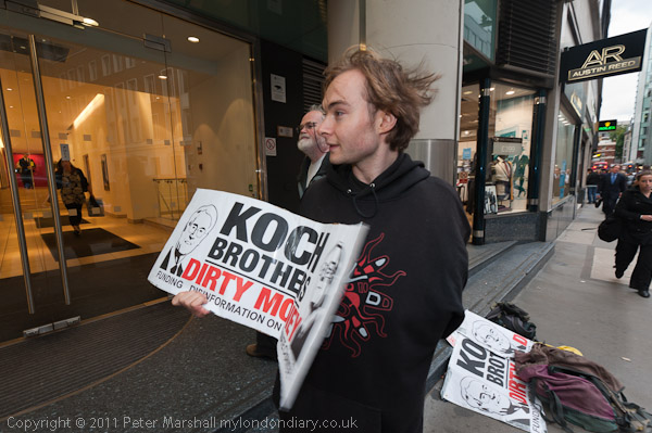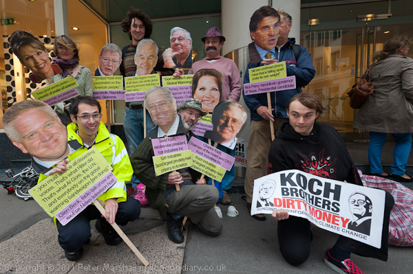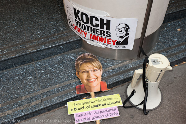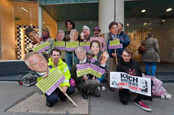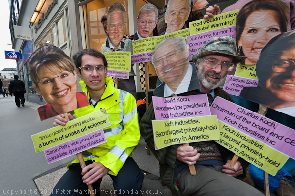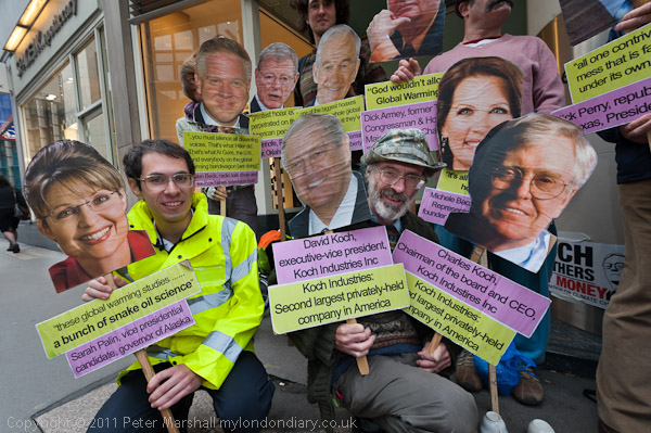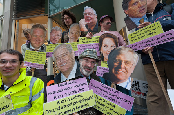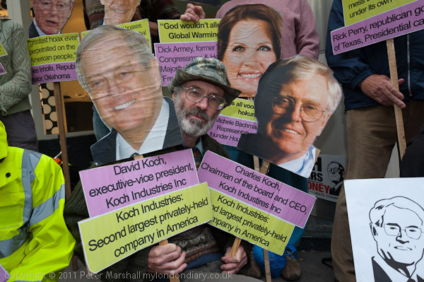 Phil Thornhill of Campaign against Climate Change with the Koch Brothers placards