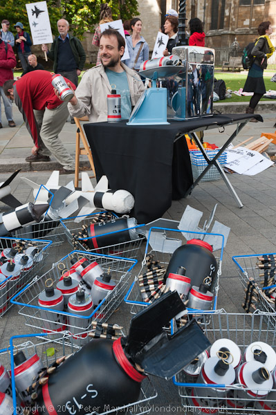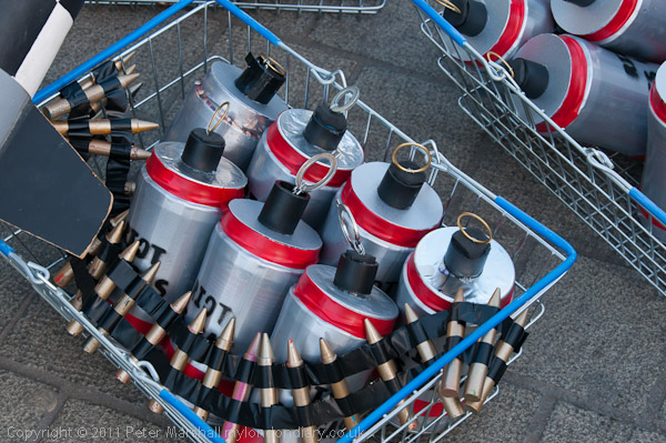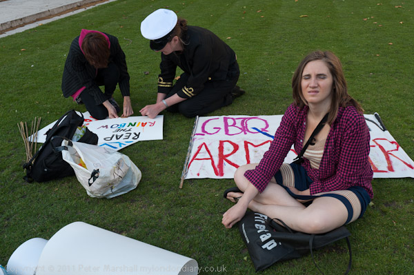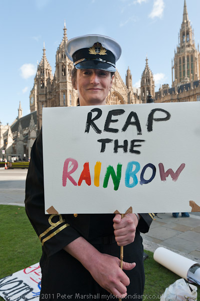 Sparkles not Shrapnel protest with placard 'Reap The Rainbow' and East London protesters