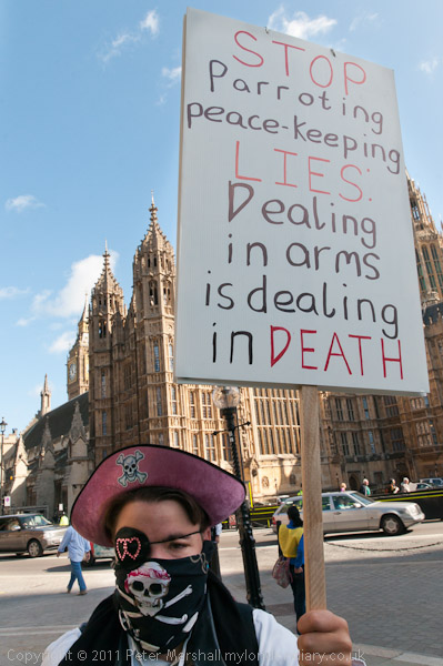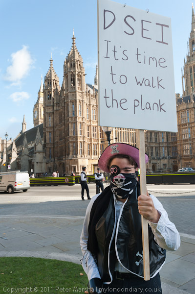 A pirate from 'Operation Hello Sailor' with placard 'DSEi It's time to walk the plank' and reminding them they are dealing in death