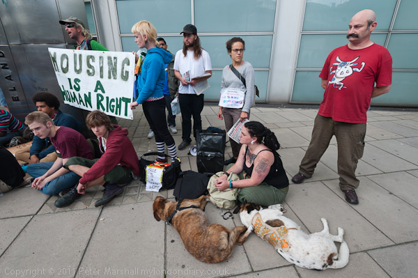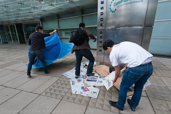 ![]() Protesters arrive and begin to set up a 'camp' with a few sheets of newspaper, some card ![]() and one tent ![]() ![]() More arrive and make themselves at home ![]() 'Housing Is A Human Right' ![]() ![]() |