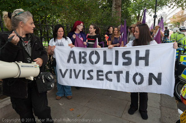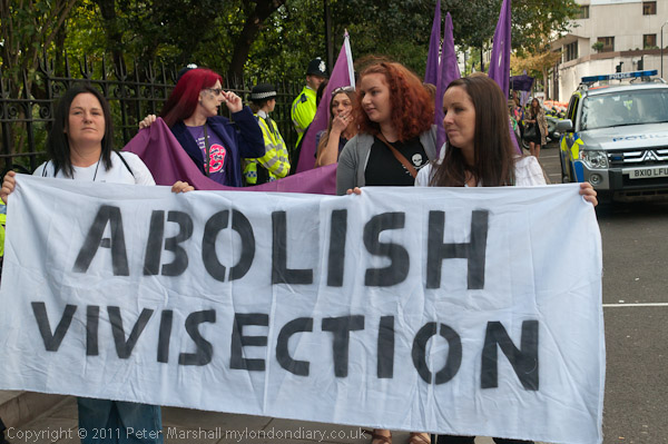 Protesters gathered at Temple, many wearing purple, the traditional colour of the anti-vivsection movement
