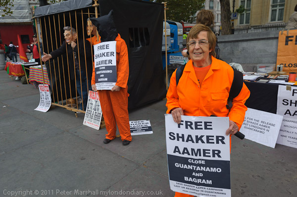 A cage held a 'Tony Blair' figure and orange clad protesters called for Shaker Aamer to be let out of Guantanamo