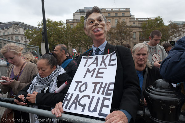 Tony Blair mask and a placard 'Take me to the Hague' - for a war crimes trial