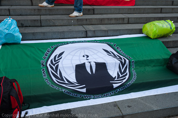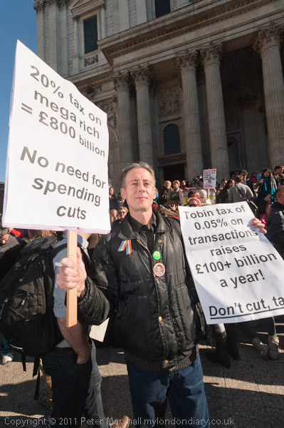 More pictures of Peter Tatchell with placards for a Tobin tax on financial transactinos and a 20% tax on the mega-rich