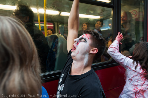 Several buses stopped for the traffic lights and were attacked by zombies