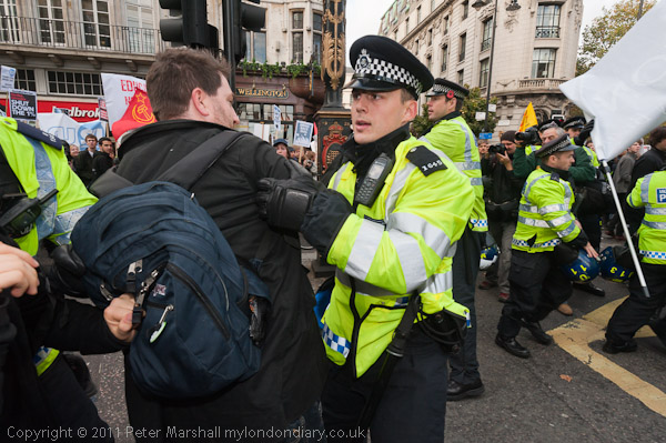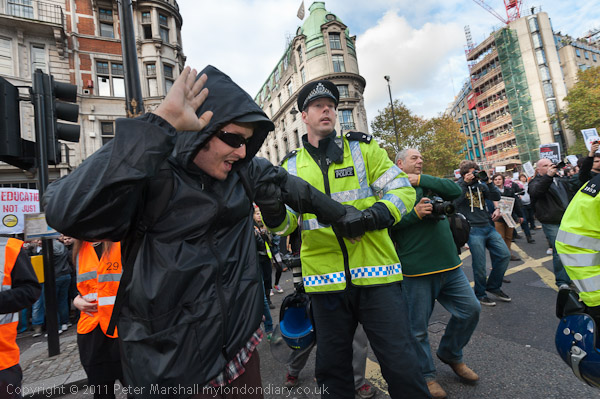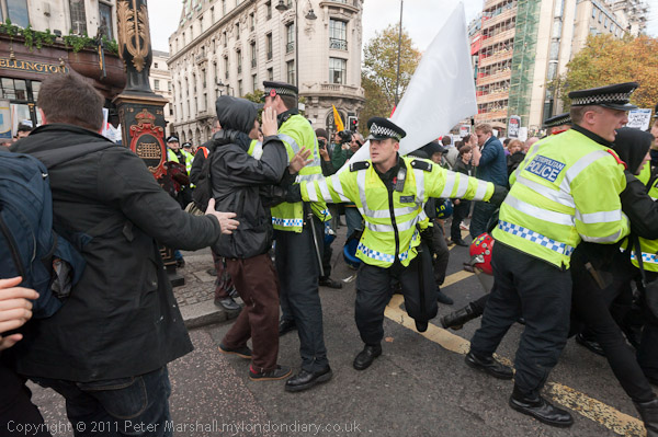 I was kicked in the leg as the police grabbed some of the protesters, only a minor injury but painful