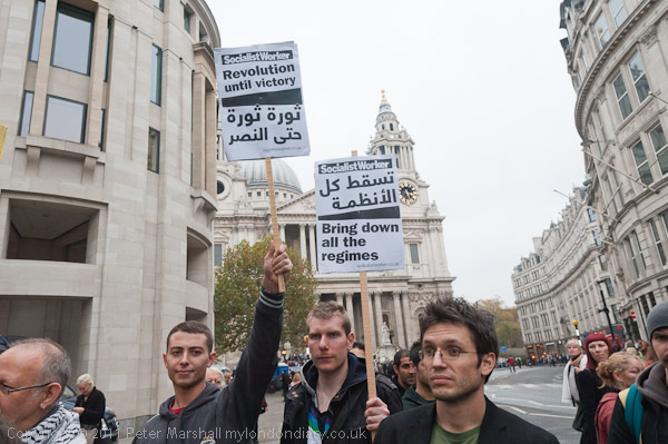 Another poster read 'UK, BAE & al. Stop the Blood Money & Decolonise'