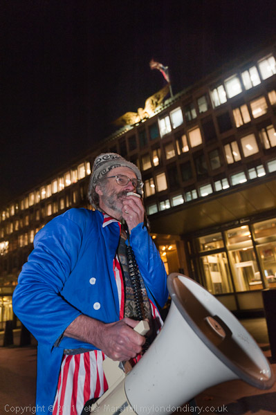 Phil Thornhill dressed in Uncle Sam coat and trousers speaking at US Embassy