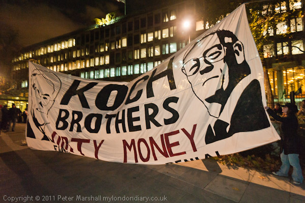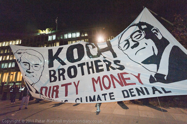But soon the banner, reading 'Koch Brothers Dirty Money Funds Climate Denial was hoisted in front of the embassy