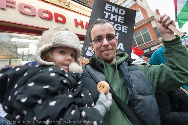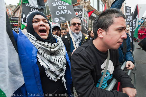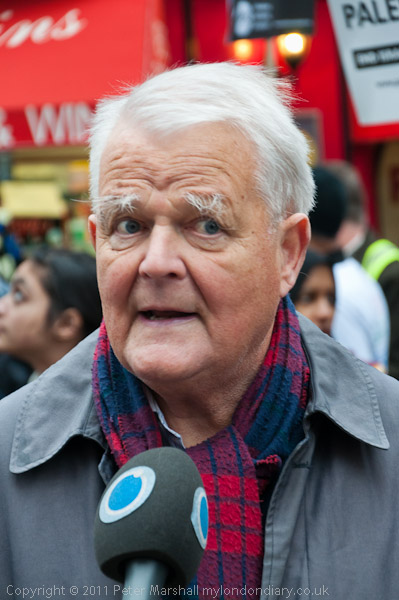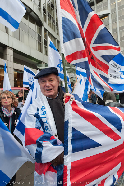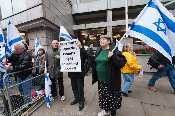 They waved Israeli flags and Union flags. There was a larger group on the road opposite supporting the Palestinians, including Bruce Kent