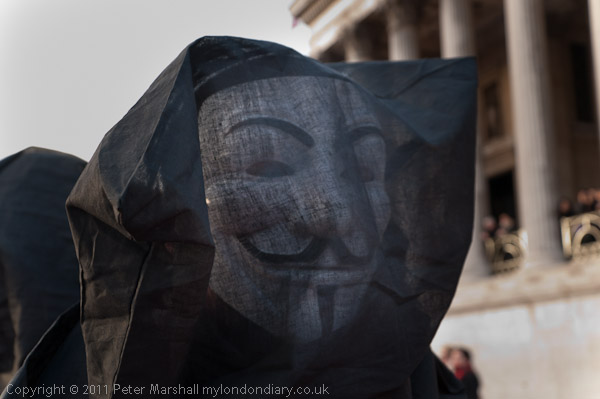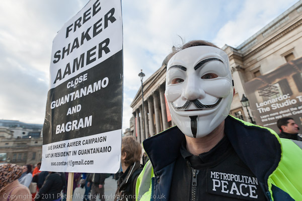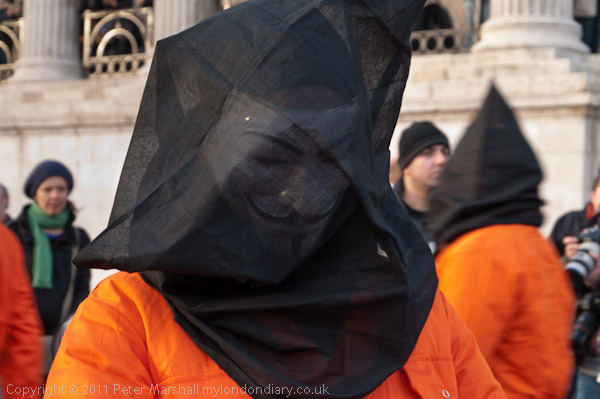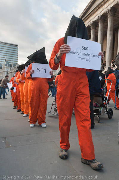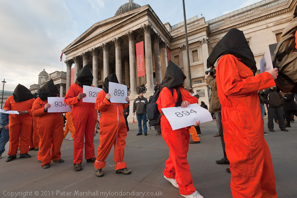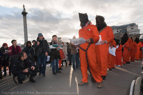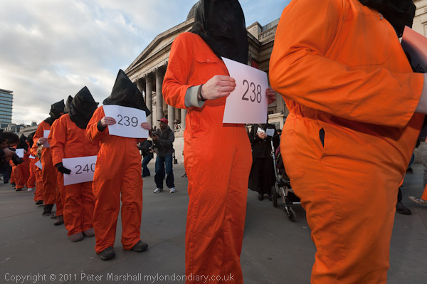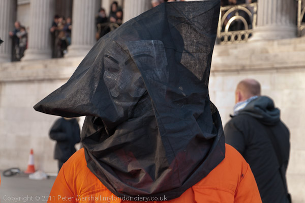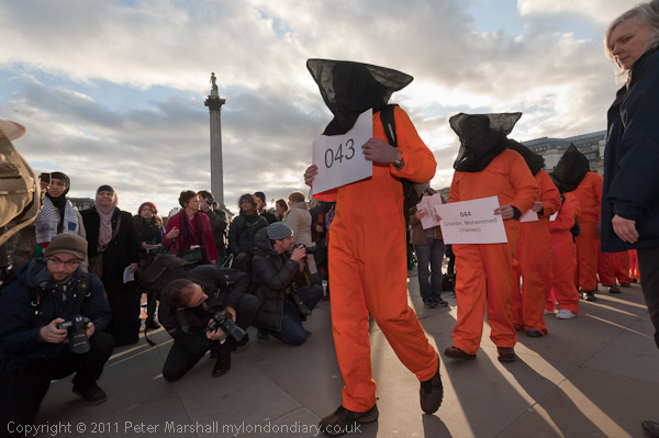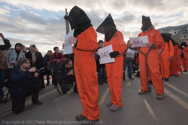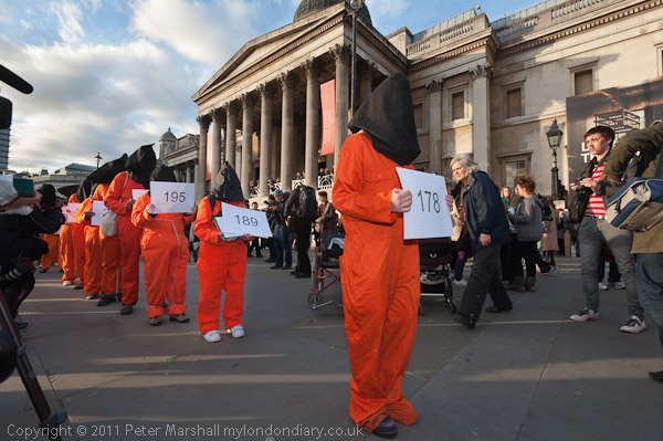 The line of 'detainees' with Guantanamo numbers, orange jumpsuits and black hoods in Trafalgar Square