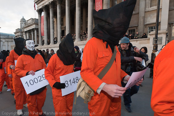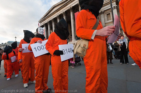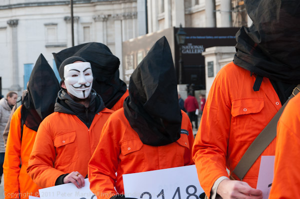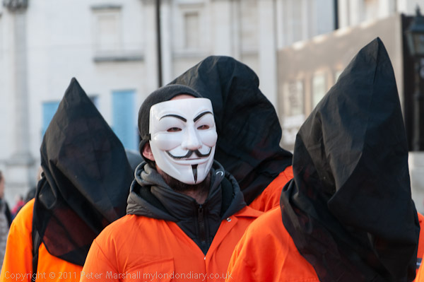 Orange jump suits, black hoods and an 'Anonymous' mask