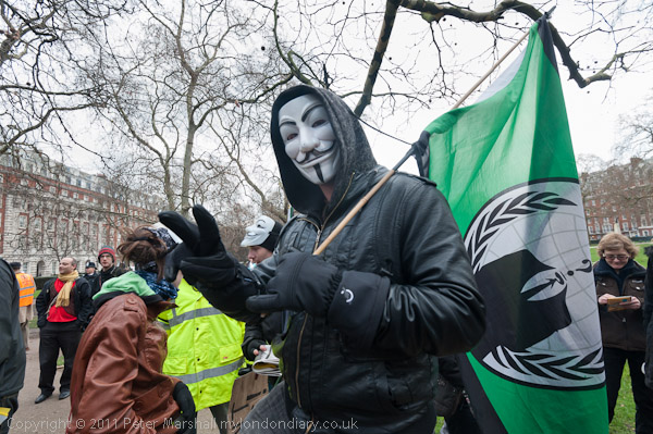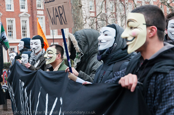 'Anonymous' supporters in Guy Fawkes (V fo Wendetta) masks hold the 'Obama Bin Lying' banner in the park