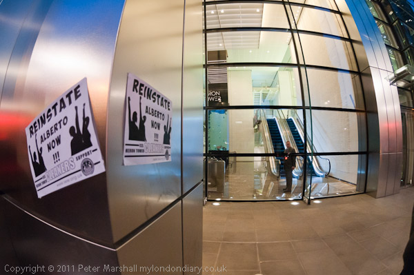 IWW Cleaners Demand 'Reinstate Alberto'Heron Tower, Bishopsgate, London. Friday 10 Feb 2012