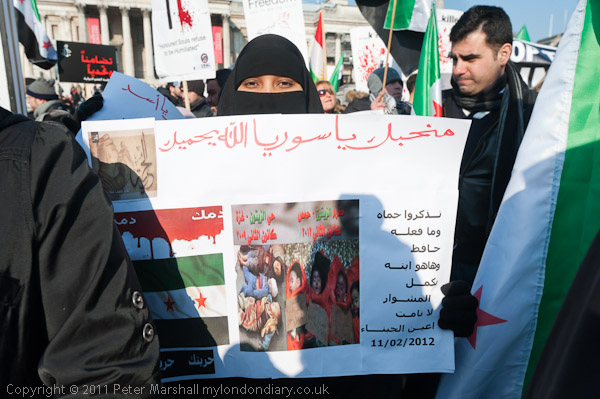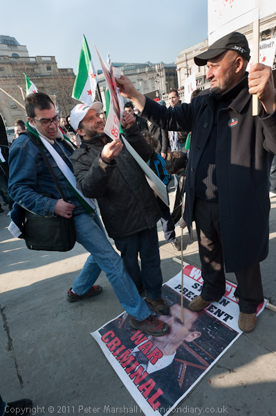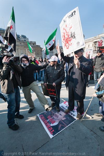 ![]() ![]() ![]() Syrians dance around the 'Homs' clock in Trafalgar Square ![]() And stamp on the face of War Criminal President Asad ![]() |