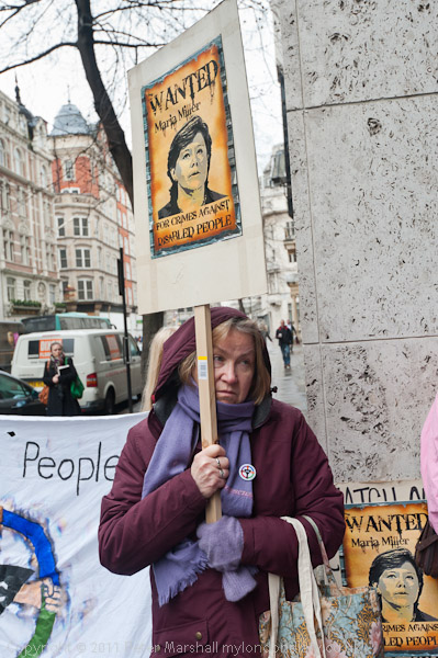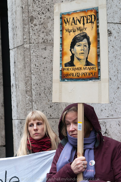 Protesters outside Caxton House with placards of Maria Miller 'Wanted For Crimes Against Disabled People'