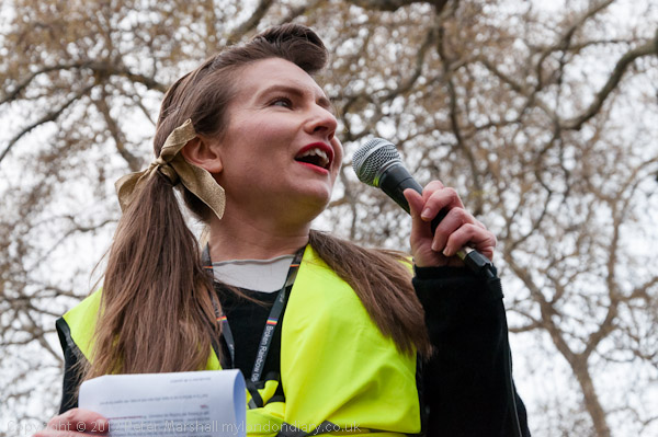 Clare B Dimyon, MBE, a solidarity LGBT activist speaking with signer