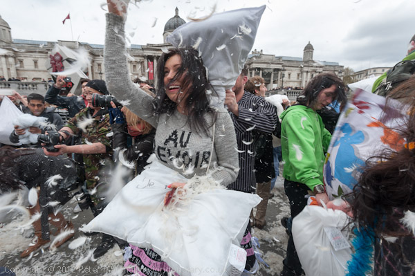 soon began to fly in the squareOver a hundred people armed with pillows turned up in Trafalgar Square on the dot at 3pm to take part in a fierce pillow fight, if not to the death at least to exhaustion over the next 30 minutes of International Pillow Fight Day.