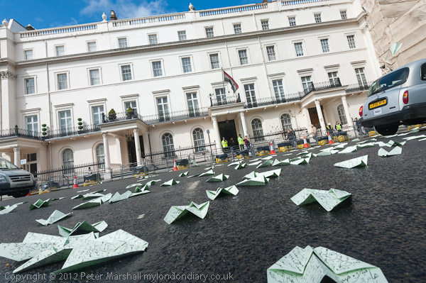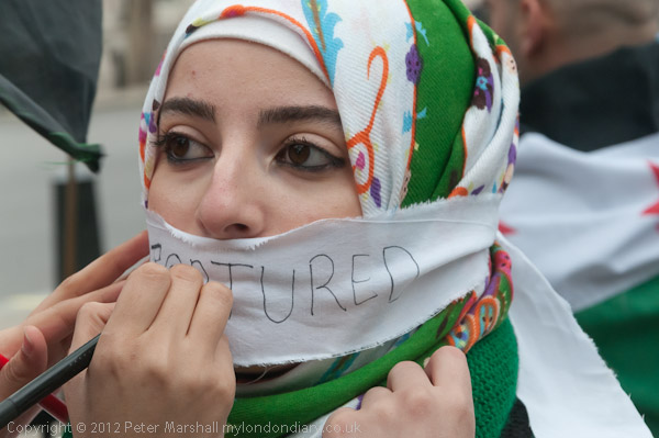 What affected me about today's protest by the Syrians were the many among those protesting whose own family members were suffering in Syria. They were not protesting against some abstract violations of human rights and human life. Many held up placards 'For My Sister', 'For My Mum' and for some at least of those wearing gags with the words 'Freedom' or 'Tortured' it was there own family who was tortured or missing or held in jail. Some held family snapshots, blown up to A4, and others were taped to the railings along with lists of names, and roses dedicated to the missing and dead.