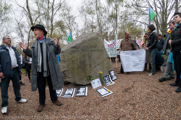 The march started with a visit to the Holocaust Memorial in Hyde Park. Gypsies - Roma and Sinti - had been the subject of discriminatory laws in Germany even before the rise of Hitler, and compulsory sterilisation and arrests of them started in 1933. In 1935 they were included in the laws against Jews and in 1938 many were put into concentration camps. When the war started they were systematically deported and killed in much the same way as the Jews. There are no exact figures for the number murdered, but it is generally thought to be around 500,000, although the total for the whole of the Nazi empire may have been considerably higher, with almost total extermination of the Roma communities in some countries and a more selective policy in others. The genocide of the Roma was formally recognised by West Germany in 1982