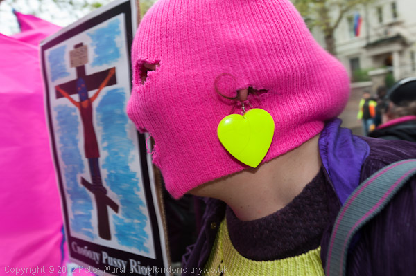 Around a hundred protesters, including a number of Russians and Climate Rush supporters came to protest on a dull damp evening at London's Russian embassy, one of many international protests calling for the release of the Pussy Riot members. At first a group gathered on the pavement outside the only embassy building on a public road where they donned hoods and scarves to cover their faces like members of Pussy Riot, but police soon persuaded the protesters to move into the pen on the opposite side of the road facing the building.