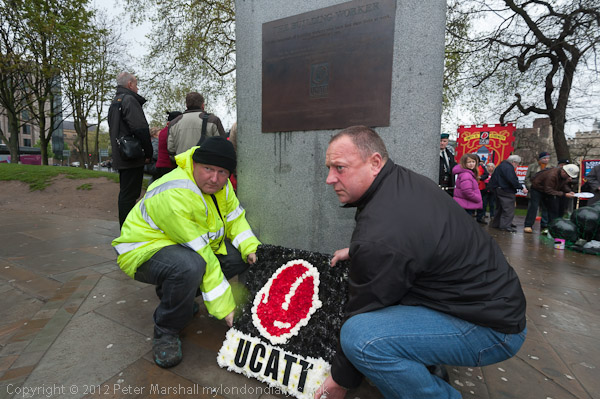 Around a hundred trade unionists and pensioners met at the statue of the Building Worker at Tower Hill on Workers Memorial Day to remember those killed and maimed at work, laying wreaths and releasing black balloons.