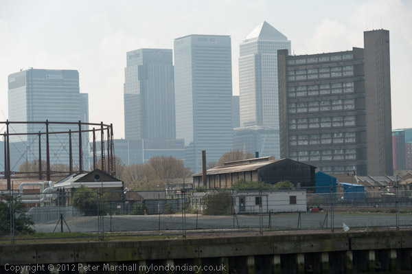 Canary Wharf and Balfron Tower, St Leonards Rd, Poplar from Cody Dock