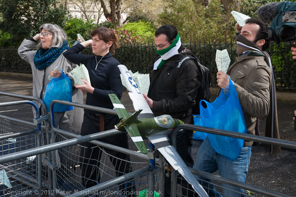 Protesters hold planes covered with the names of Syrians killed by goverment forces in recent months