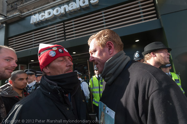 The protesters walked and ran along Oxford St, with a low sun behind them making photography difficult