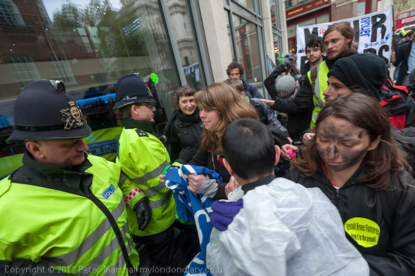 Police try to prevent people holding up a banner to the hotel window