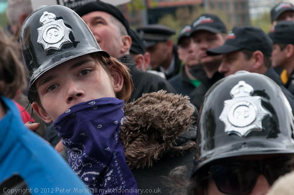 Occupy in Police helmets. The police had 16,000 black caps - the number of officers expected to lose their jobs