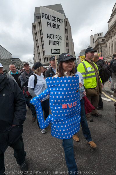 The Defend The Right To Protest group reminded police marchers of Alfie Meadows, Sean Rigg, Ian Tomlinson, Jean Charles de Menezes and others