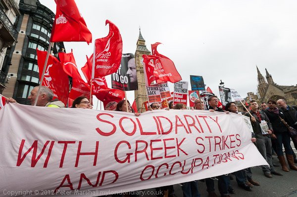 The banner at the front of the march -'Solidarity With Greek Strikers And Occupations'