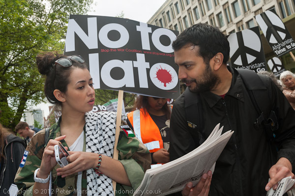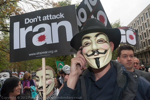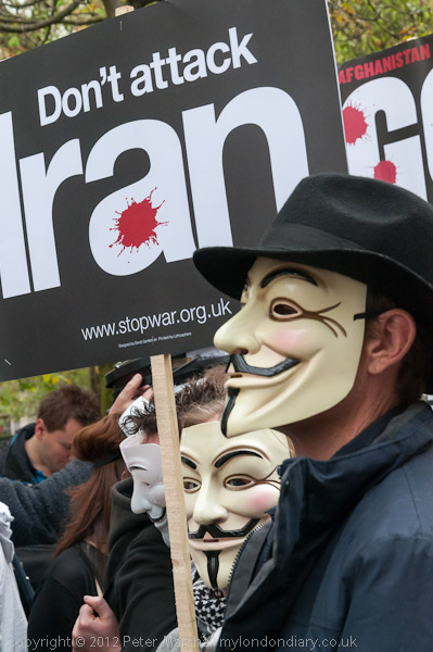 Anonymous masked suporters hold Stop The War placards at the US Embassy